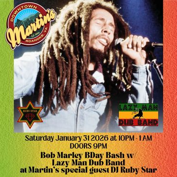 Come celebrate Bob Marley's birthday with us with a sound track full of Bob tunes done by local reggae masters, Lazy Man Dub Band, on Jan 31st! The tunes and party kick off at 9pm with Sky High Reggae's DJ Ruby Star spinning hot reggae. Lazy Man at 10pm. Tickets are on sale now at https://www.ticketleap.events/.../bob-marley-birthday...